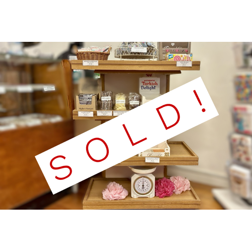 Available is a multi-tiered, freestanding wooden display unit crafted from light-coloured wood. This unit features four shelves, each supported by vertical posts, resulting in an open and accessible display structure. Formerly used in a Laura Ashley homewares store, it serves as a versatile and functional display option suitable for domestic or retail environments. The shelves are not fixed to the central column, allowing for easy repositioning and flexibility.