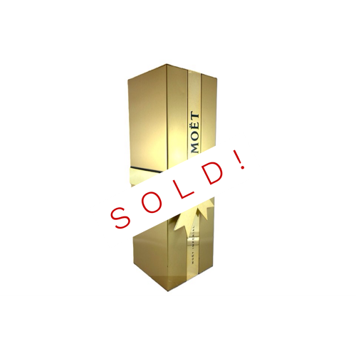 On offer is a gold-coloured metallic box with the brand name MOËT prominently displayed on it. The tall and rectangular box, with a ribbon and bow design in the middle, gives it a luxurious and festive appearance. Opening the glamorous box is as easy as simply twisting the top half. Once a gift box for a bottle of champagne, which was enjoyed long ago, it has featured in many of our window displays over the years.