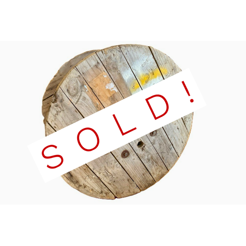 Our cable drum shows signs of wear and tear with various markings, labels and paint on its surface, hinting at its former life. This item has consistently served as a key feature in our store, whether positioned vertically as a backdrop in window displays or horizontally in retail presentations. Its versatility allows for numerous applications in both interior and exterior settings.