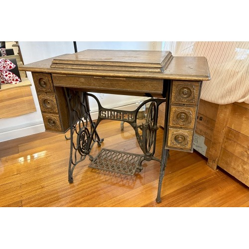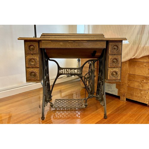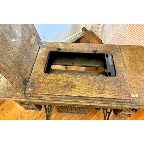 This Singer sewing machine cabinet features a wooden construction, likely made of tiger oak, with several carved drawers on each side. It includes a wrought iron base with a treadle mechanism intended to power a sewing machine. The cabinet is designed to house a Singer sewing machine and has a coffin-shaped hinged top for protecting the machine when not in use. These types of cabinets were commonly produced in the early 20th century, around 1913. Although the sewing machine itself is no longer included, the table remains as an example of vintage craftsmanship