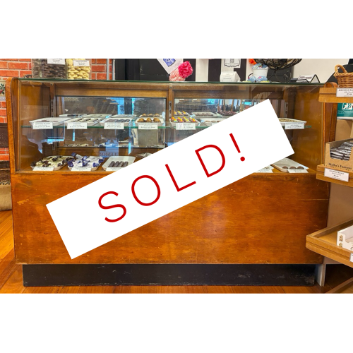 Available from early November is this vintage display counter featuring a glass top and front. The cabinet is crafted from wood with an attractive visible grain and a distressed finish, reflecting its age through natural scratches and wear. The display area is enclosed by glass on the top and front panels, and the cabinet boasts a rectangular silhouette with elegantly rounded upper corners. Inside, it is equipped with two tiers for product displays, including an original bevelled glass shelf supported by chrome brackets; the shelf height is adjustable to suit various display needs. The doors located behind the shelves feature mirrored backing, which serves to visually enhance the display area. Behind the counter, a drawer once served as register for transactions, marking remnants of a past era. This versatile counter has previously served in a barber shop, a man cave, and most recently as a feature in our chocolate shop for the past 12 years.
